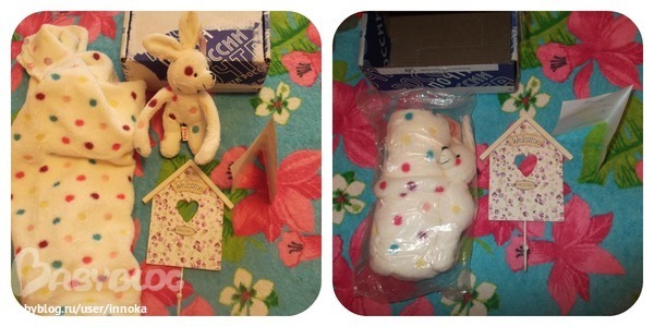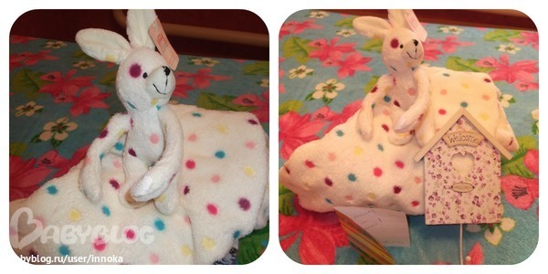 .подарочки нам очень понравились,Руслан сразу хотел зайца в рот затащить.Плед уже крутится в машинке))) он такой мягкий обожаю такие вещи)