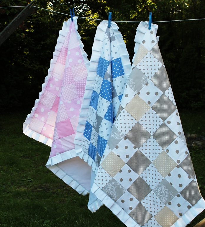 К сожалению других дизайнов еще нет( времени пока нашить в другой технике не было, но идеи есть: например внешнюю сторону сделать не квадратиками а цельной тканью, а края например отделать не рюшами а кружевом, ну и так далее...но есть выбор тканей, возможно что то вдохновит;) на фейсбуке есть моя страничка с фотографиями других пледиков( Lallababy)