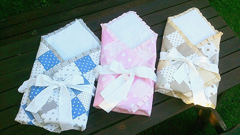 Решила пополнять ассортимент, и первыми на очереди оказались очаровательные конвертики- одеяла на выписку. Размер 80х80, одеяльцо собирается в конвертик и подвязывается лентой ( сзади вшита резинка, так что вполне себе эластичненько) . После приезда пупса домой, легким движением руки конвертик становится одеялом и дальше радует малыша. Цвета самые популярные: розовый, голубой и беж для ценителей сюрпризов) внутри синтепон, но конечно ж наполнитель можно выбрать любой: шерсть, лен, синтепон разной плотности)