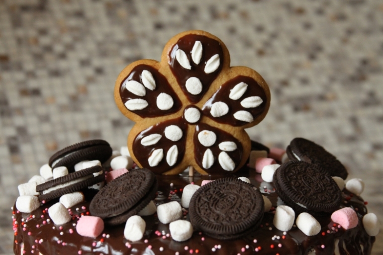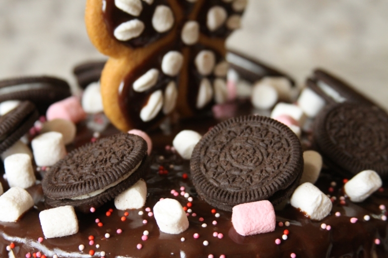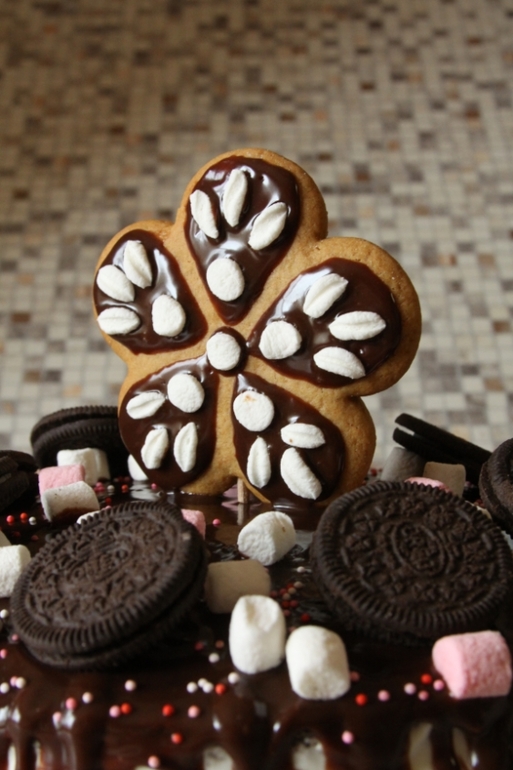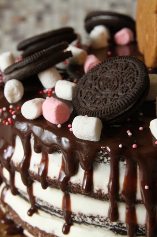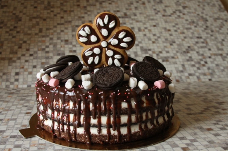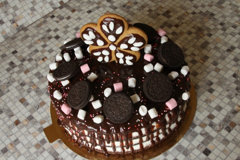 Шоколадный влажный бисквит, взбитые сливки, глазурь шоколадная, вкусняшки для украшения :)