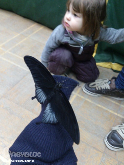 Потом пошли смотреть на ручных добрых бабочек, которые людей не боятся, на разные части тела садятся. Мне одна на попу села даже. ) За крылья мы их не трогали, только за лапки поднимали. Лизуше понравилось вроде, правда она сама подержать бабочек не захотела, когда на нее садились, кричала им "Кыш-кыш". )) Вот такая фотка есть.