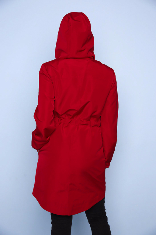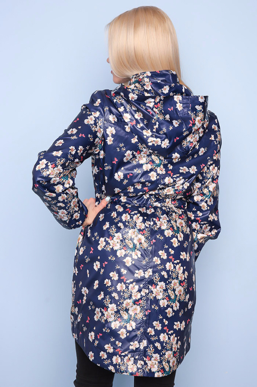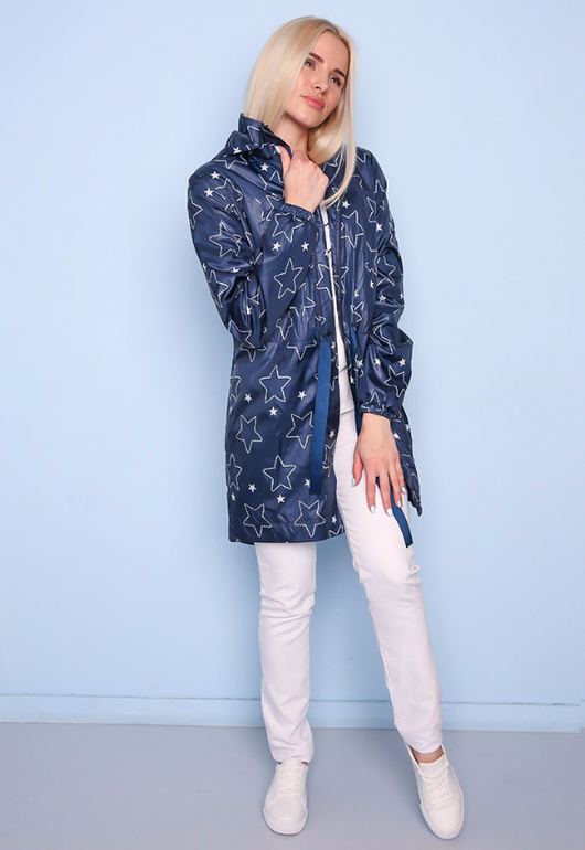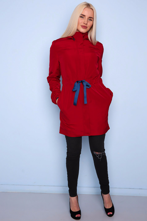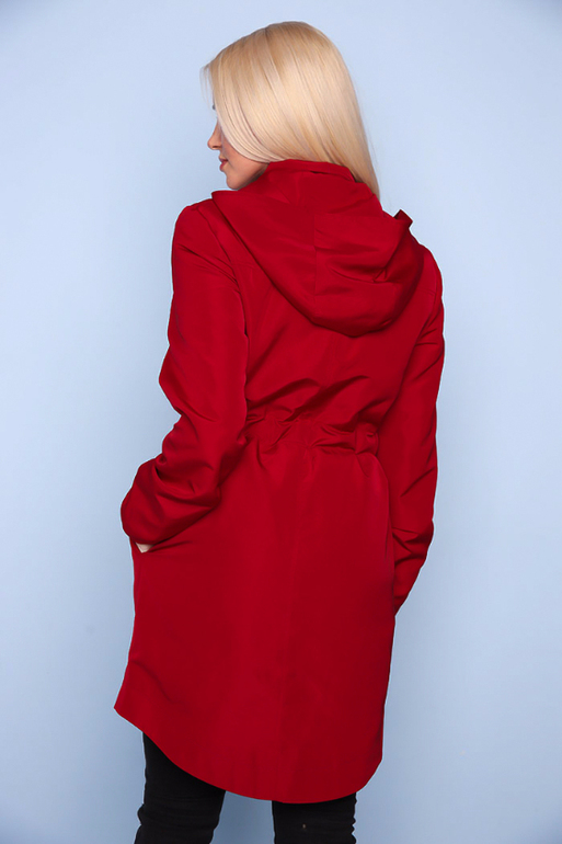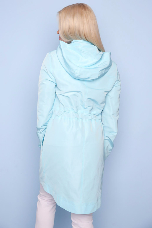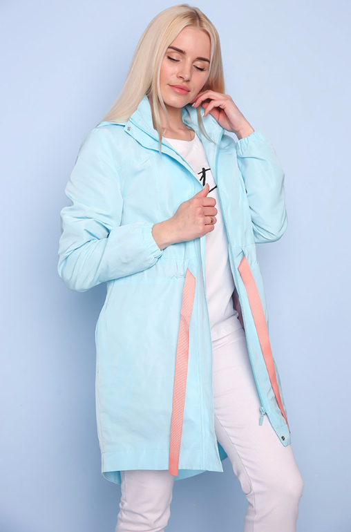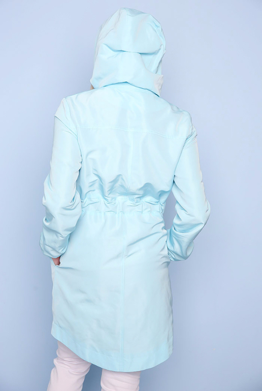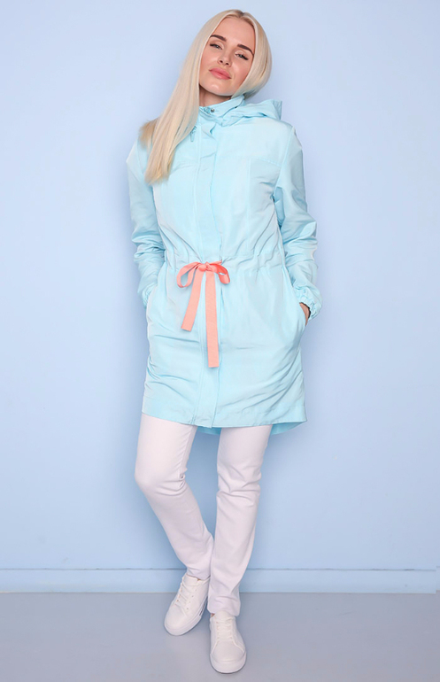 Легкая ветровка-парка из плащевой ткани с фигурной линией низа и капюшоном. Изделие свободного кроя. Длинный втачной рукав на узкой манжете с резинкой. На талии расположена широкая притачная кулиска с декоративным бантом из репсовой ленты. Центральная застежка-молния скрыта широкой планкой. Планка фиксируется на две потайные кнопки. В боковых швах расположены карманы. Изделие на подкладе. Подкладка, молния и декоративный бант- контрастного цвета. Капюшон отстегивается. Материал не растяжимый.Длина изделия по спинке 42-44 размер 90 см, 46-48 размер 91см, 50-52 размер 95 см.