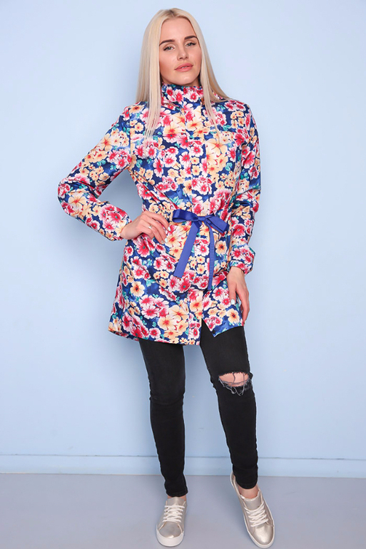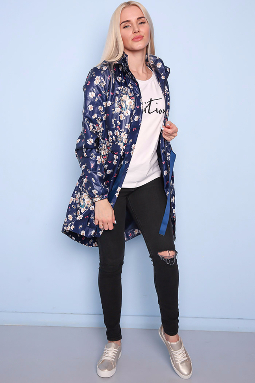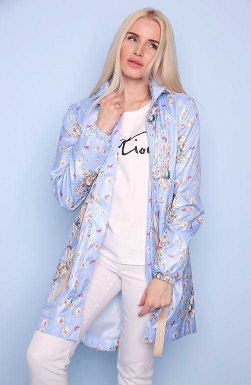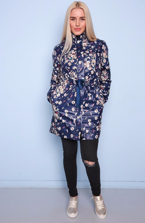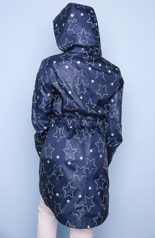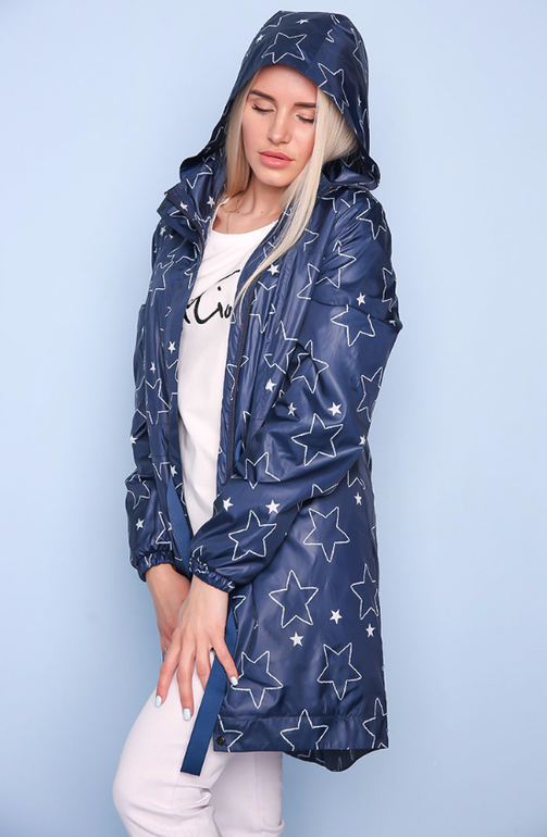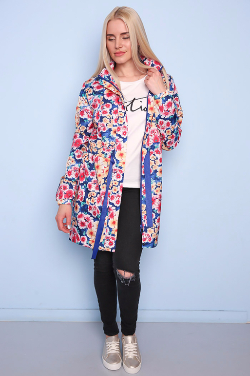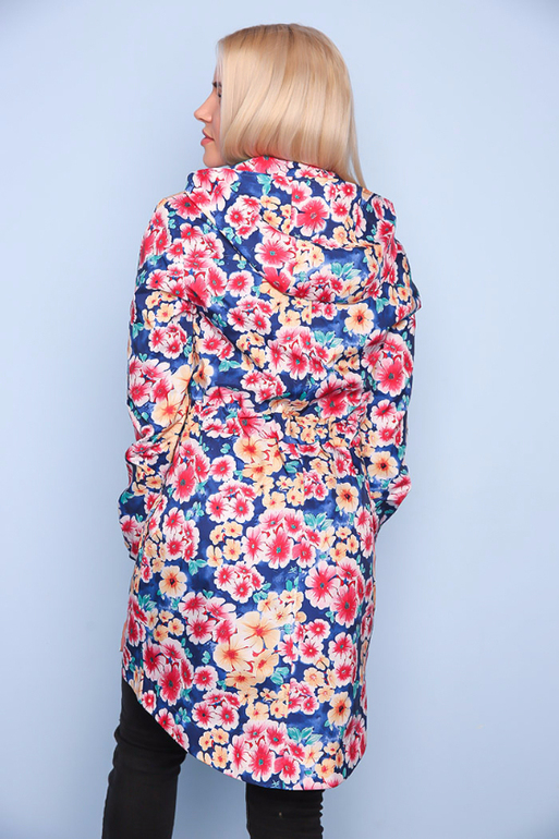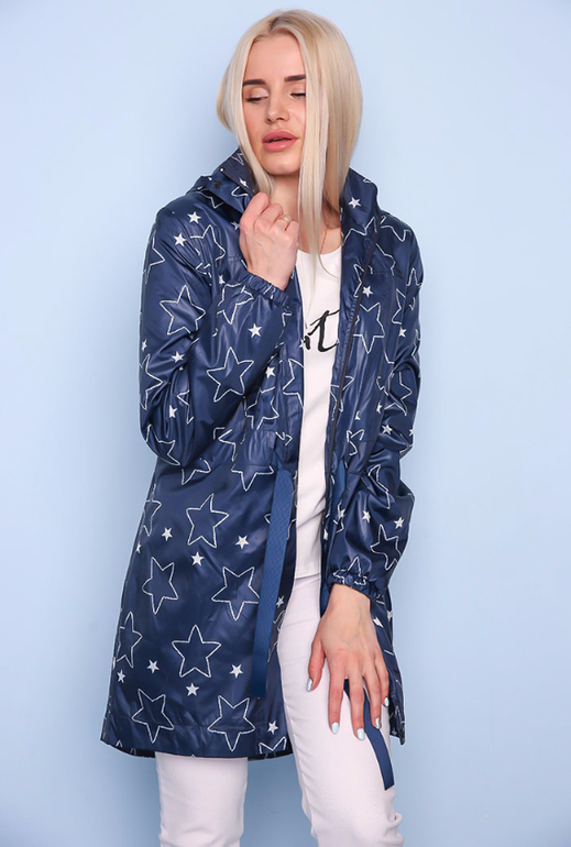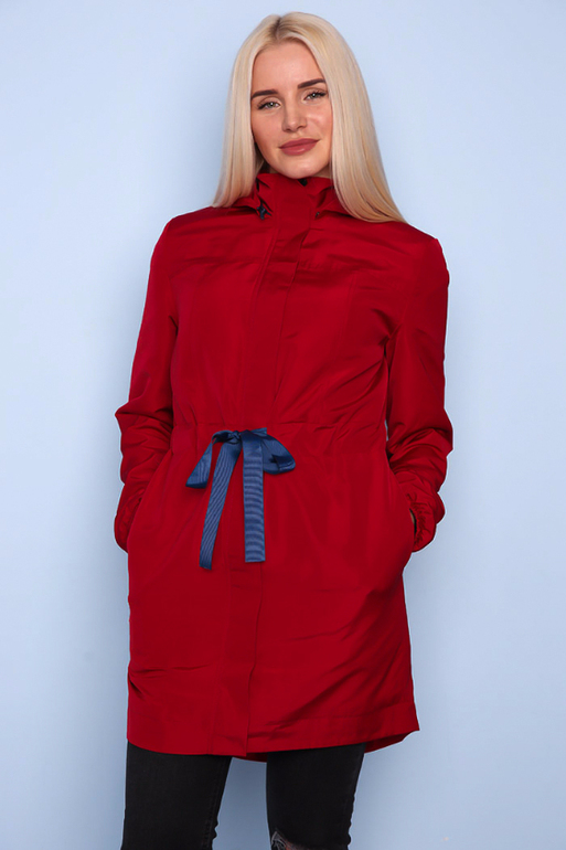 Легкая ветровка-парка из плащевой ткани с фигурной линией низа и капюшоном. Изделие свободного кроя. Длинный втачной рукав на узкой манжете с резинкой. На талии расположена широкая притачная кулиска с декоративным бантом из репсовой ленты. Центральная застежка-молния скрыта широкой планкой. Планка фиксируется на две потайные кнопки. В боковых швах расположены карманы. Изделие на подкладе. Подкладка, молния и декоративный бант- контрастного цвета. Капюшон отстегивается. Материал не растяжимый.Длина изделия по спинке 42-44 размер 90 см, 46-48 размер 91см, 50-52 размер 95 см.