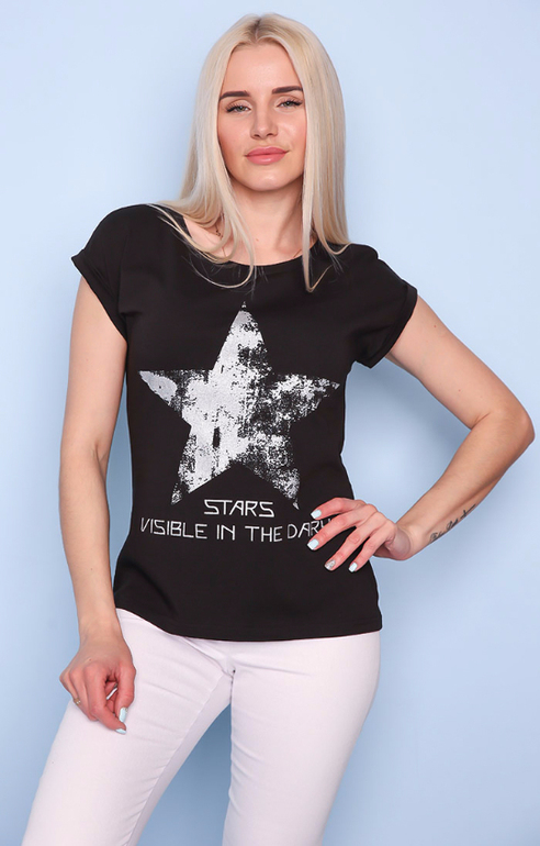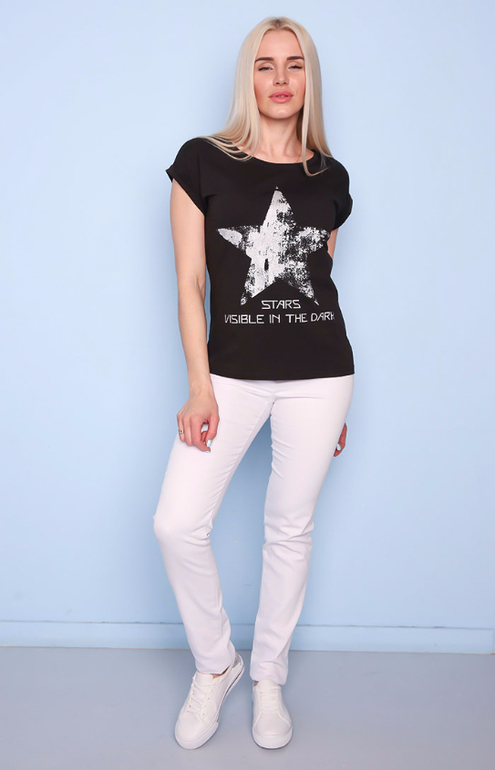 Джемпер свободного силуэта из хлопкового полотна с круглым вырезом горловины и цельнокроеным рукавом с отворотом. Перед изделия декорирован печатным принтом контрастного цвета.Длина изделия по спинке 42-44 размер 56см, 46-48 размер 59 см, 50-52 размер 61 см.