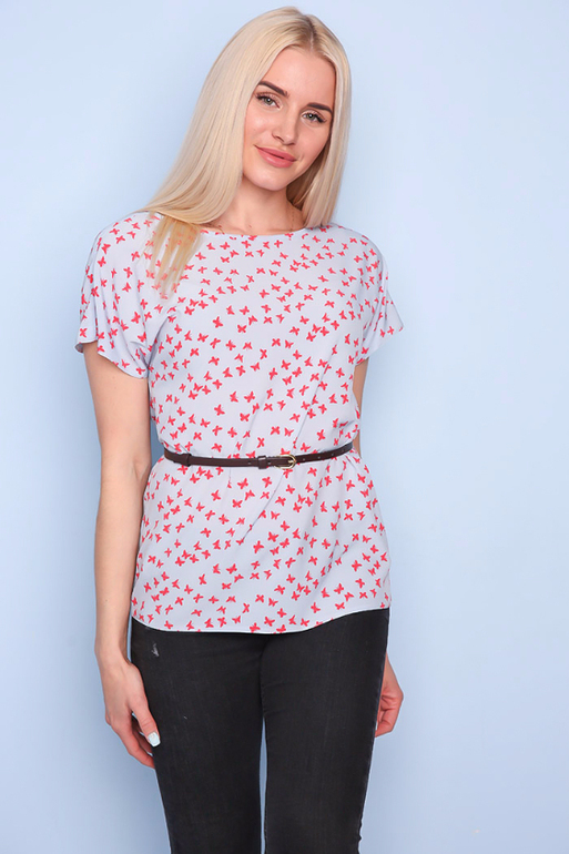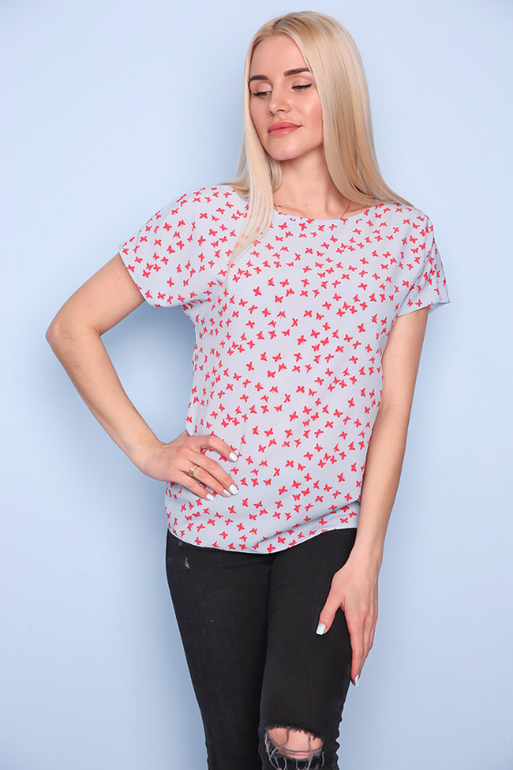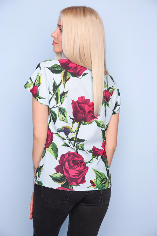 Блузка из крепа свободного кроя с коротким цельнокроенным рукавом.Длина изделия по спинке 42-44 размер 62 см, 46-48 размер 63 см, 50-52 размер 64 см.