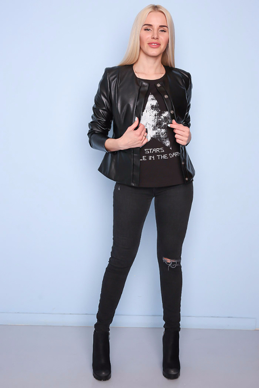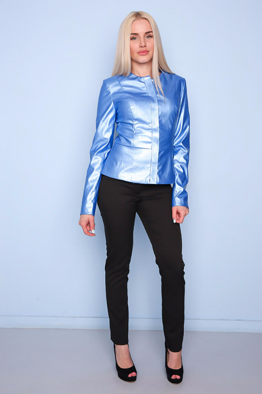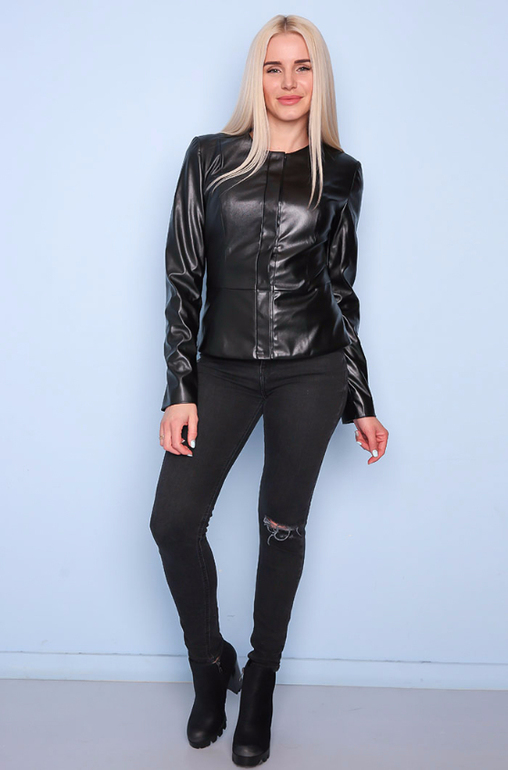 Куртка прилегающего силуэта из искусственной кожи с баской. Изделие отрезное по линии талии. По переду и спинке изделия проходят вертикальные рельефы.