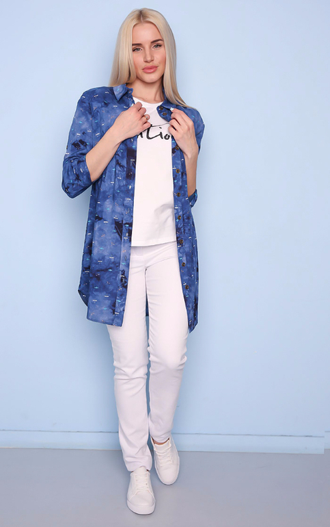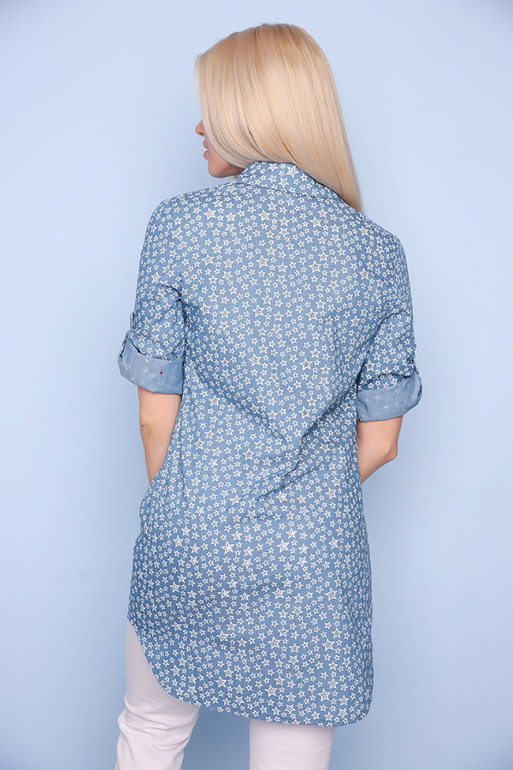 Туника свободного силуэта из тонкой джинсовой ткани . Модель с отложным воротничком рубашечного типа. Центральная застежка на планку с пуговицами. Рукав дополнен манжетой с застежкой на пуговицу. Длина рукава регулируется с помощью паты и пуговицы.Фигурный низ изделия. Ремень в стоимость не входит.