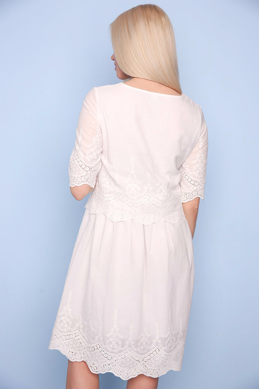 Платье свободно сулуэта из тонкого батиста с вышивкой и фестонами. Изделие отрезное по линии талии. Деталь юбки слегка присборено сверху. Верхняя часть платья отлетная. Рукав до локтя. Изделие на подкладе.