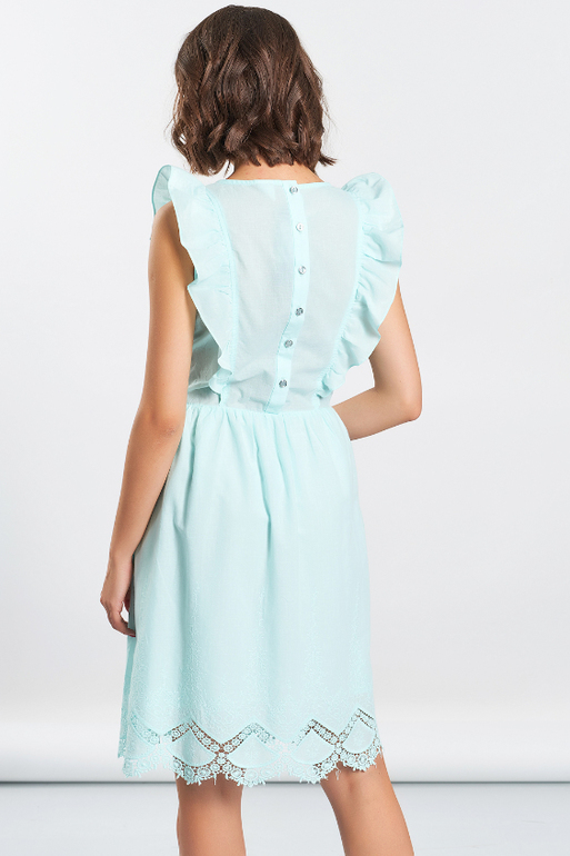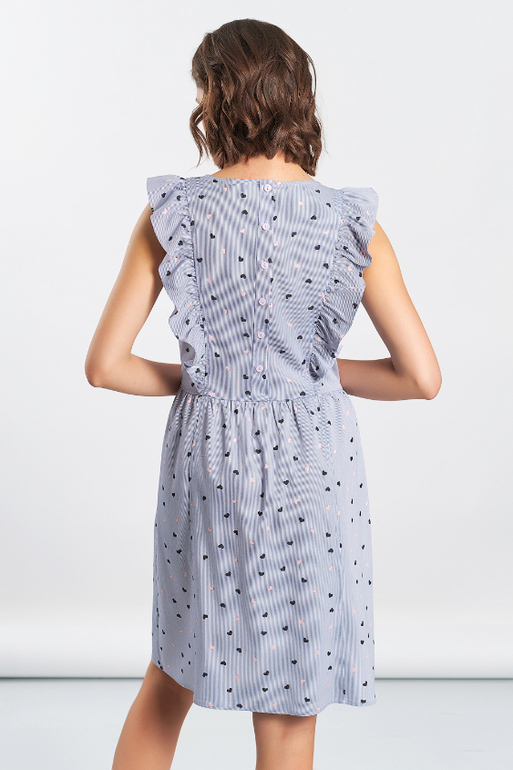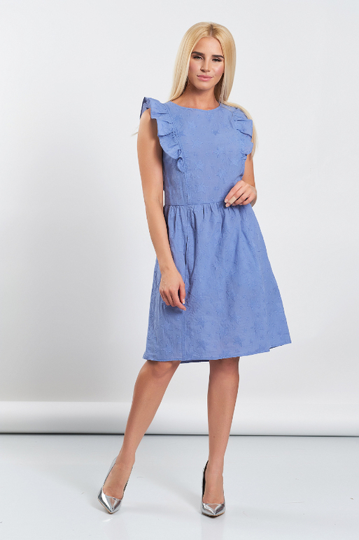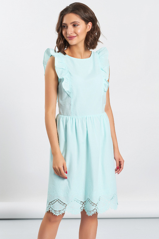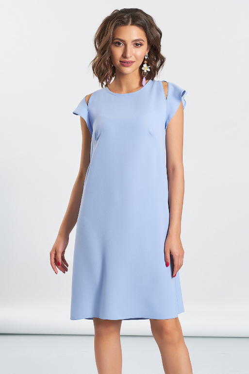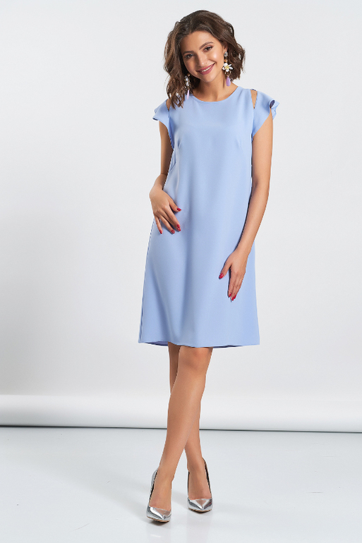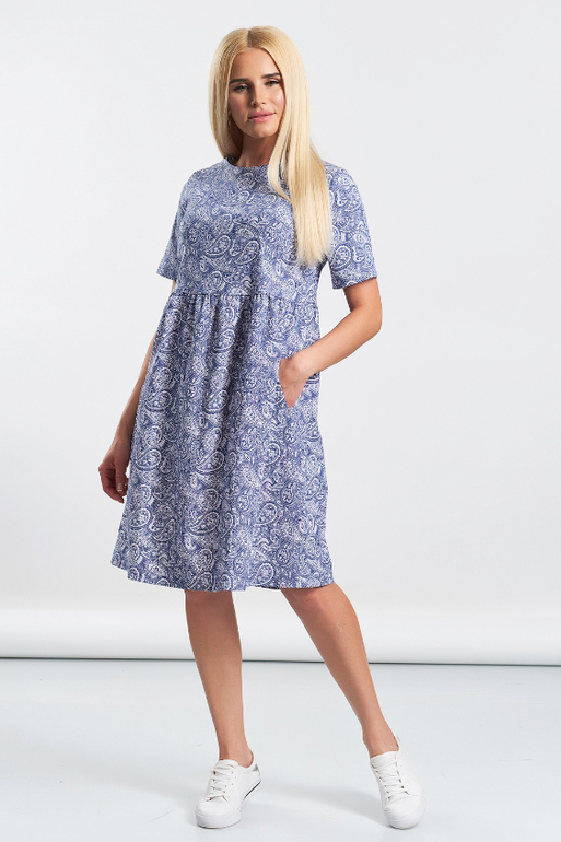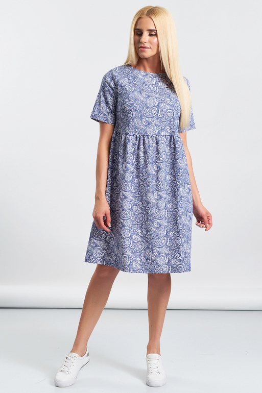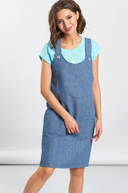 Платье свободного силуэта из тонкой джинсовой ткани. Круглый вырез горловины. Короткие втачные рукава. Модель с завышенной линией талии, отрезная, с легкой сборкой.Низ изделия расклешенный. На спинке изделия расположена декоративная планка с пуговицами, имитирующпя застежку. Спереди изделия расположены прорезные карманы.