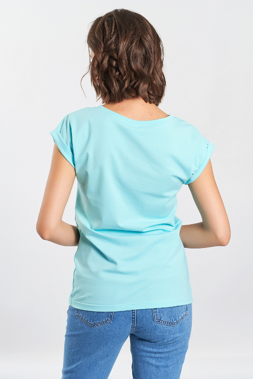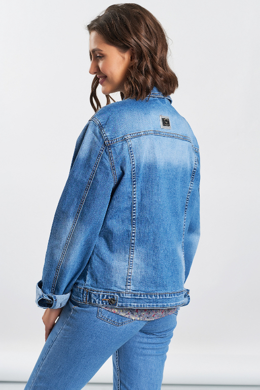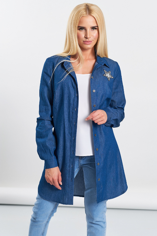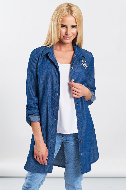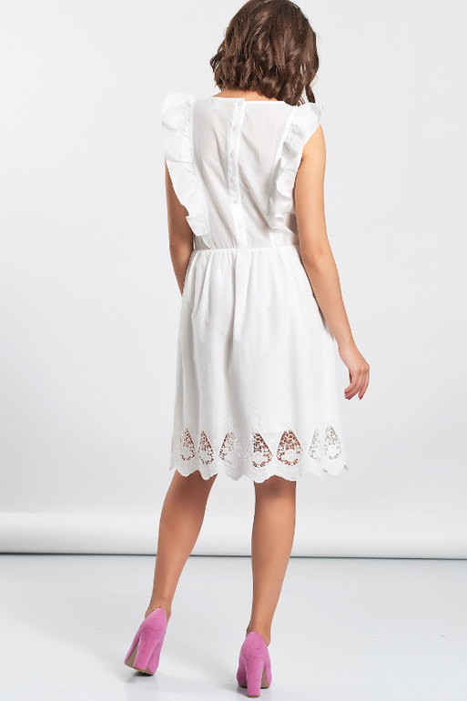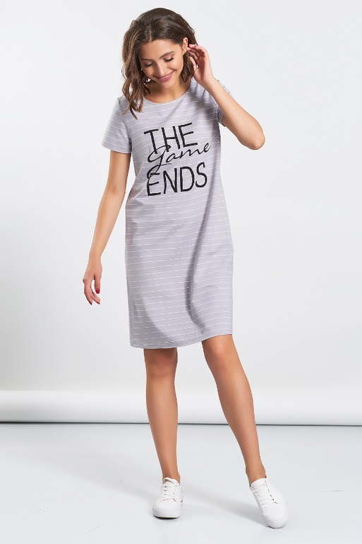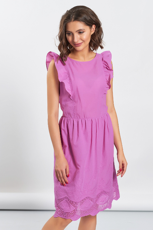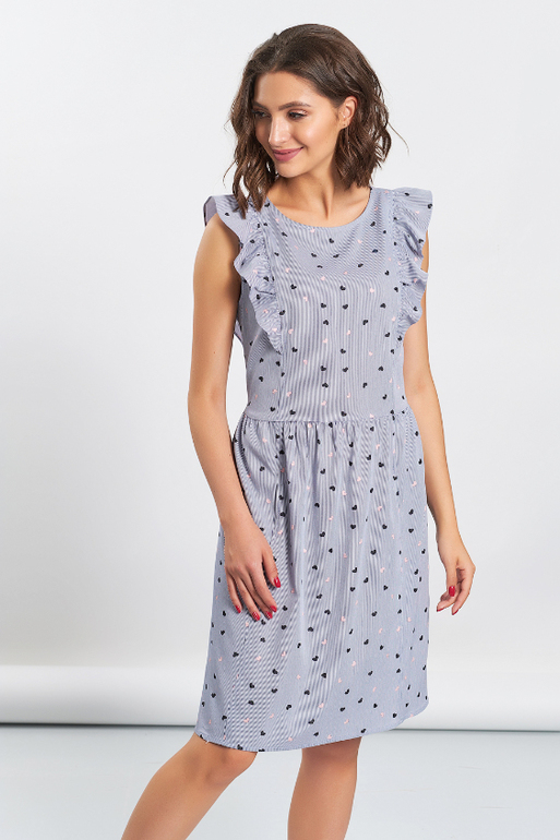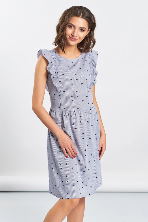 Платье свободного силуэта из тонкой джинсовой ткани. Круглый вырез горловины. Короткие втачные рукава. Модель с завышенной линией талии, отрезная, с легкой сборкой.Низ изделия расклешенный. На спинке изделия расположена декоративная планка с пуговицами, имитирующпя застежку. Спереди изделия расположены прорезные карманы.