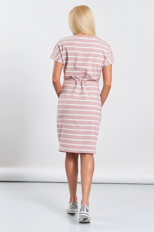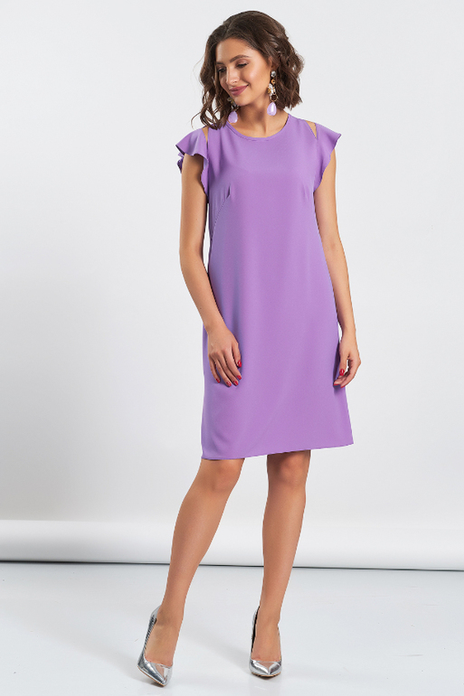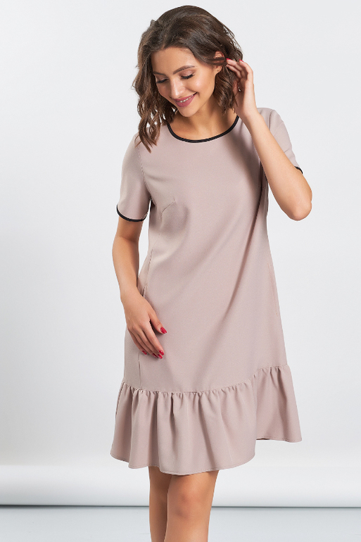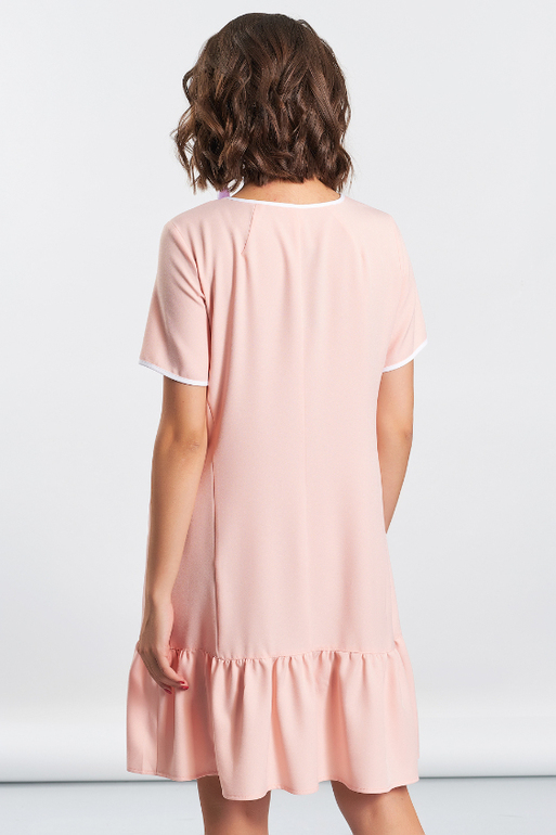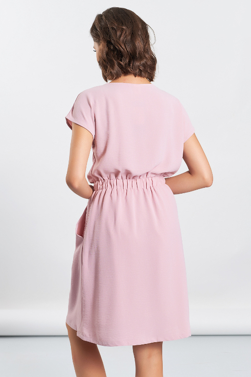 Платье из тонкой плательной ткани. Короткий цельнокроенный рукав. Изделие с отрезным поясом на широкой резине. На уровне бедер расположены прорезные карманы. Низ изделия на подкладе, расклешенный.