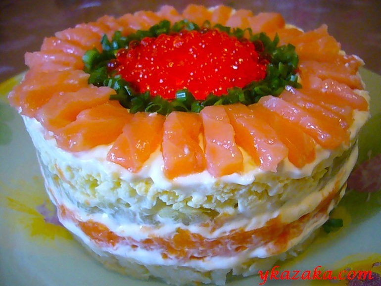 Когда салат собран, даем пропитаться перед подачей на стол, в течение 3-х часов, а еще лучше накрыть его пищевой пленкой и поставить в холодильник на ночь для пропитки. Перед подачей на стол украшаем блюдо красной икрой и листьями салата. ======================================