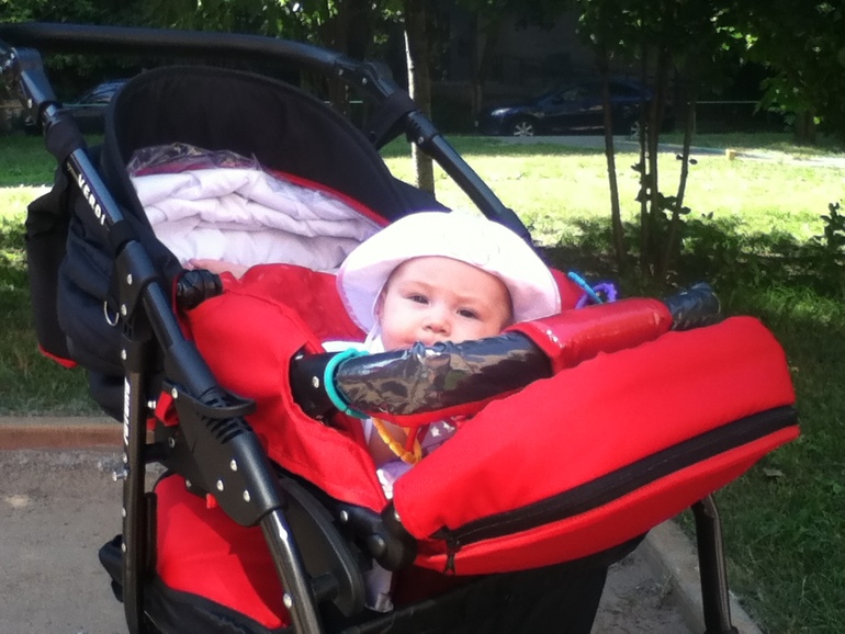 В начале пятого месяца мы потеряли дневной сон. Спит по полчаса четыре раза в день (раньше спала 1- 1,5). Теперь полчаса и просыпается, рассматривает все вокруг. Мы с Серегой прозвали ее "Танюшка, по полчаса сплюшка". Ну не спит больше и не спит, не заморачиваюсь, значит ей столько нужно. Но на руках таскать по улице свои семь килограмм не хочется. По такому случаю пришлость пересесть, вернее лечь) из люльки в прогулку, теперь ездит лежа на животе, головой вперед и вертит, вертит ей по сторонам, мир изучает, прохожим улыбается. Перекладываю на спину, ворчит, ругается. Выглядит это как-то так.