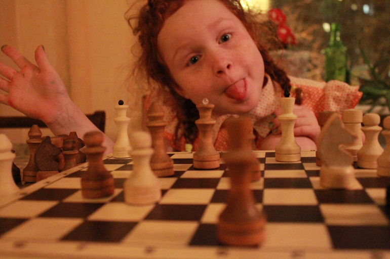 Света быстро запомнила, как стоят фигуры на доске, как кто ходит. Я не очень-то сильный игрок, но для нее пока мой уровень - самое то. Главное, удовольствие.