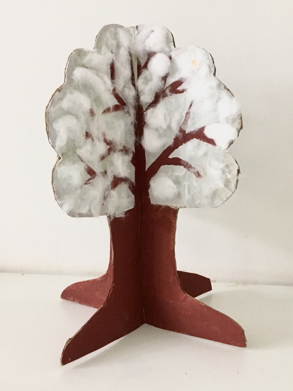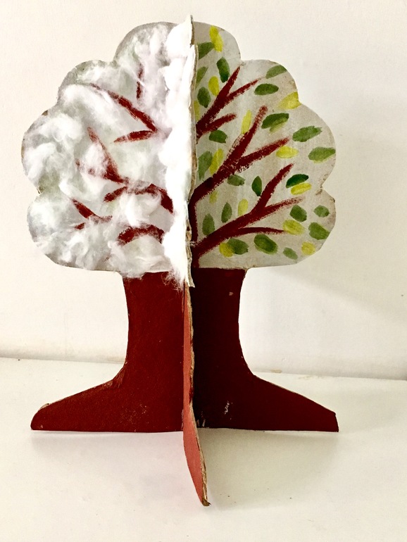 Изучаем времена года . С дочерью сделали вот такое дерево из двух листов картона . Делается очень просто : рисуем макет нашего дерева , вырезаем . Переводим на картон в двух экземплярах. Затем нужно сделать прорези -у одного экземпляра сверху , у другого снизу . И вставляем один в другой . Потом вместе расскрасили . Дочь довольна 😊