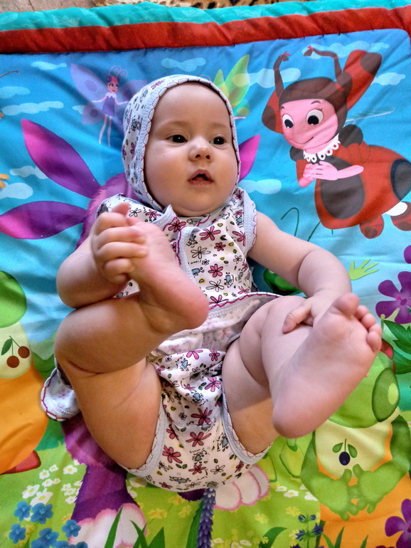 Ну вот, наконец то колики и бессонные ночи позади! Наш вес 7500, рост 68 см. Доча уже во всю берет ручками погремушки, играет с ними. Переворачивается на живот, на спину. Смеется в голос. Узнает родных людей которых часто видит. К чужим очень настороженно относится- смотрит и думает если ей человек понравился она улыбается ему, а если нет может расплакаться. Играет около 3 часов, спит по 30 минут, иногда может и 2 часа проспать. Спит на руках, только начинаю ложить на кровать она просыпается, поэтому я ее держу на руках, чтоб поспала нормально. Купили ей недавно говорящий телефон, он сказки рассказывает песни поет, загадки. Она конечно этого не понимает, но когда включается песенка, ей нравится.