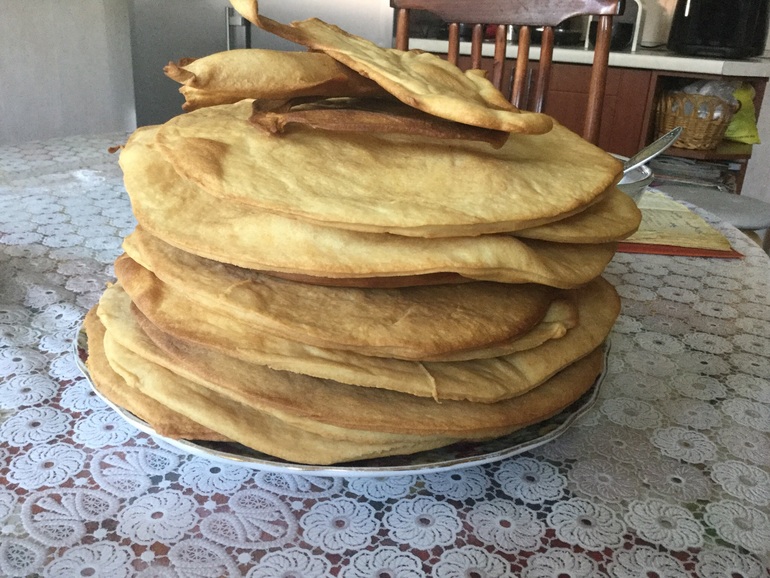 На столе сыпем муку и раскатываем коржи, 8 шт или больше если раскатывать совсем тоненькие коржи.