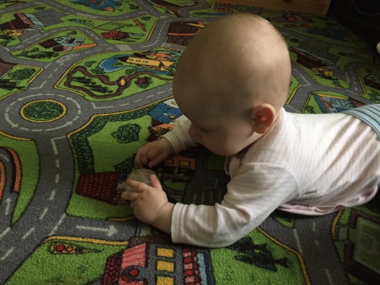 🌷 совершенствует умение доползать ( ползет до укатившегося мячика)