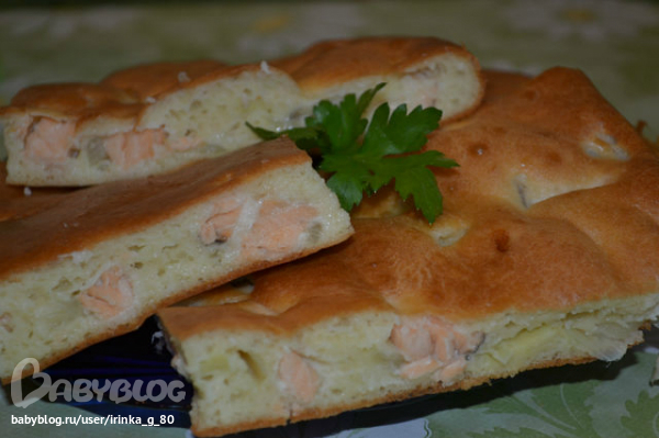 3 яйца, 250 гр. майонеза, 250гр. кефира или сметаны, 1ч. ложка соли, 0,5 ч. ложки соды, 1,5 стакана муки. Часть теста выливаем на противень, выкладываем нарезанный лук, а сверху рыбу (у меня семга) заранее посоленная и поперченная. Затем заливаем остатками теста. ставим в духовку и выпекаем минут 30. Этот пирог вкуснее есть холодным.