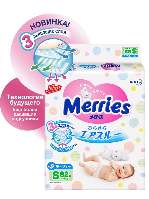 Продам 4 пачки подгузников Merries р-р S (4-8кг), в пачке по 82шт.