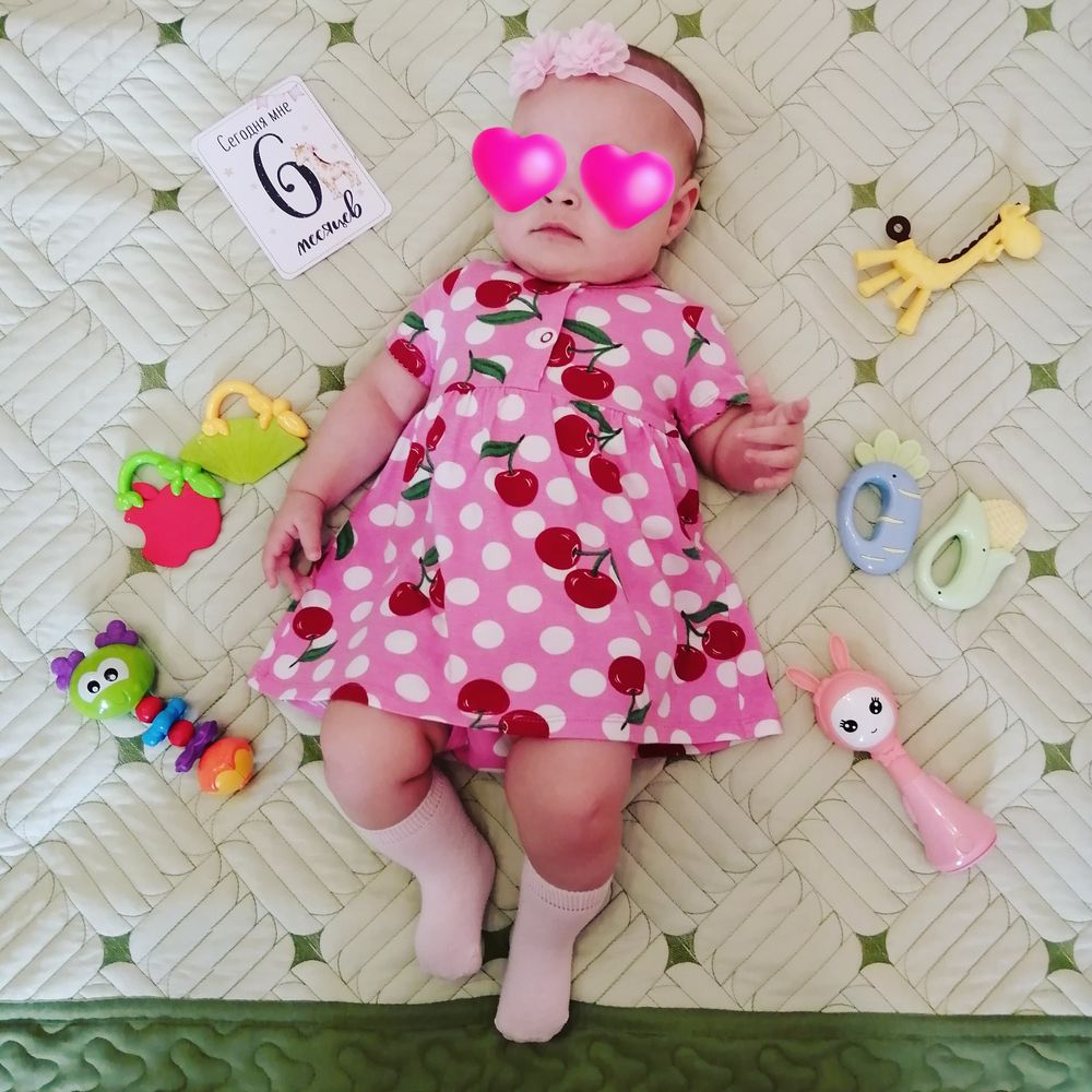 Нашей крошке сегодня 6 месяцев. Вес 8600 рост примерно 70 см. Из умелок переворот на живот и обратно. Поднимание попы. Болталки папа, баба, аба-аба, аку. Улыбашечка😊😊😊
