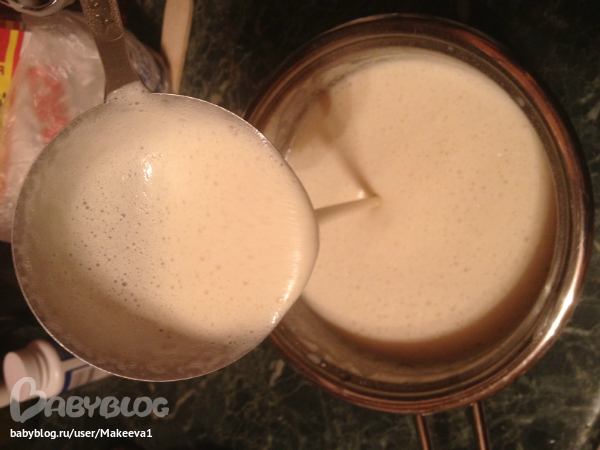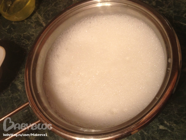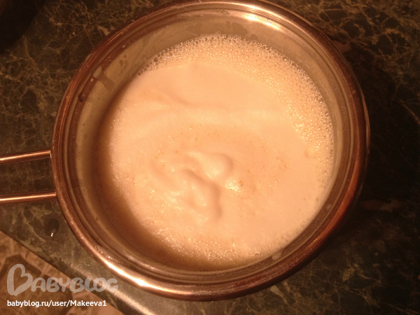 Нагреваем молоко, в теплое молоко добавляем ТОЛЬКО желтки от 3-х яиц, перемешиваем..Добавляем соль, сахар...Пробуем на вкус...взбиваем миксером...получается такая картина: