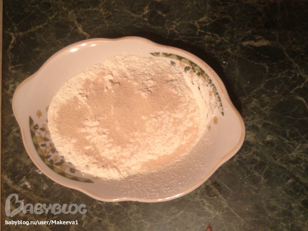 В эту смесь добавляем муку, заранее перемешанную с дрожжами и просеянную через сито..