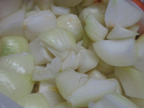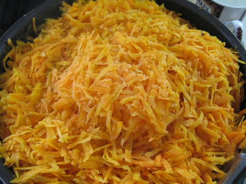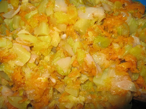Режим их на кусочки, морковь трем на крупной терке, лук тоже крупными кусочками.