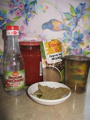 Затем добавляем все остальные ингредиенты: соль, молотый перец, сахар, лавровый лист и уксусную эссенцию. Все это кипит еще 0,5 часа