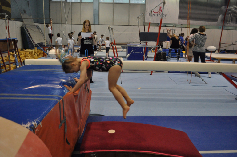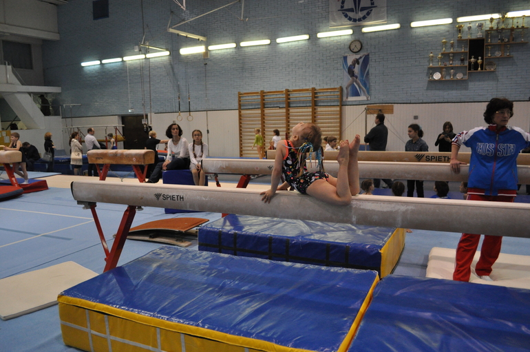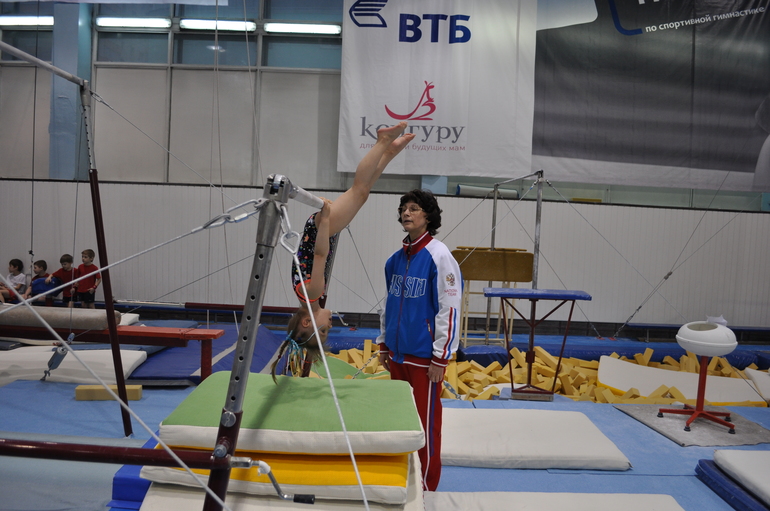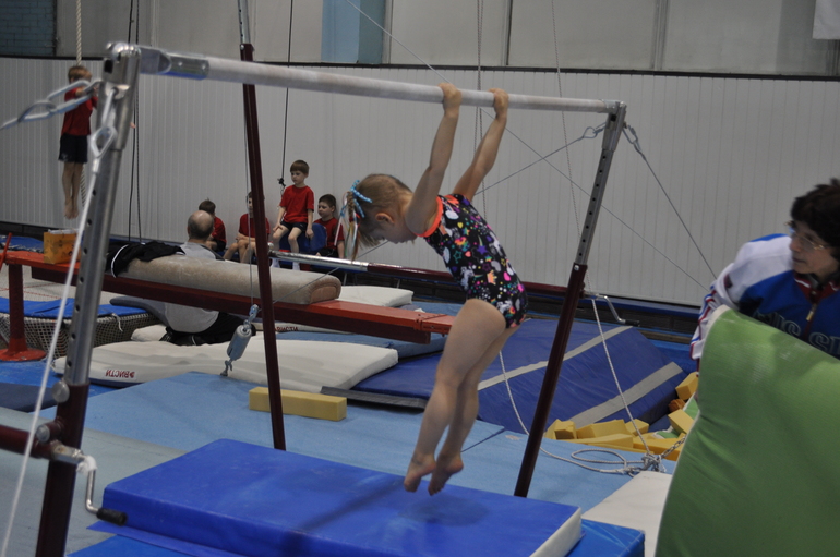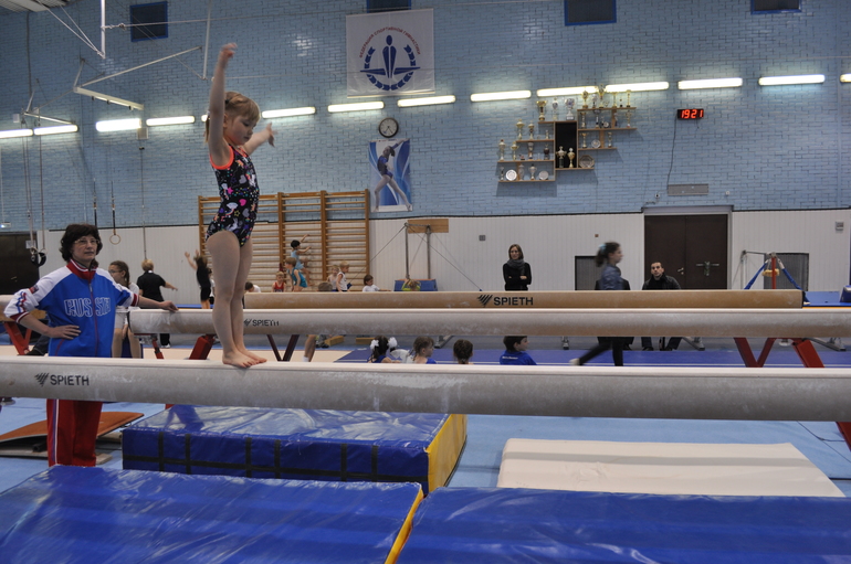 Апрель 2015г. 4 года 11 мес. До этого были только по ОФП. А это настоящие, по снарядам. Правда, первенство только командное, личного не было. И тем не менее Варвара выступила отлично. На прыжке получила 8,8, на вольных упражнениях 9,0, на брусьях 9,5, на бревне (!) 9,8!!! Бревно - супер комбинация. Я сама занималась спортивной гимнастикой, но и я удивлена. Комбинация сложная (на мой взгляд, на для 4-летнего ребенка). Но Варя даже не покачнулась ни разу!!