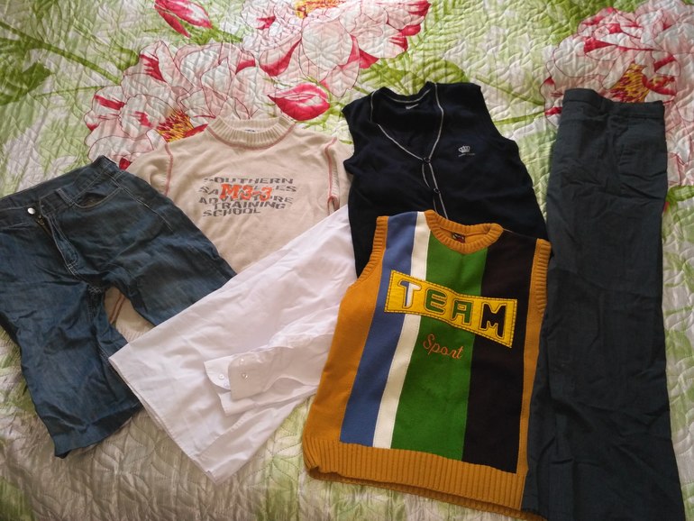 Здесь школьные брюки, и жилетки для школы. На некоторых вещах есть пятна.