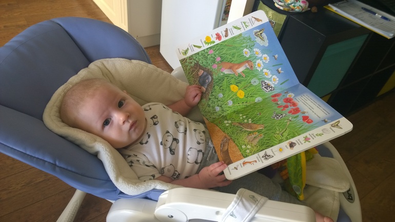 В этом месяце начали с Максимом книжки-картинки рассматривать, не ожидала такого интереса и внимания с его стороны, то ли действительно его картинки так захватывают, то ли пока просто нравится слушать мой голос и смотреть куда я пальцем показываю. Но в любом случае минут 10-15 в день, сидя в шезлонге, мы теперь рассматриваем картинки и слушаем мамины рассказы о нарисованном.