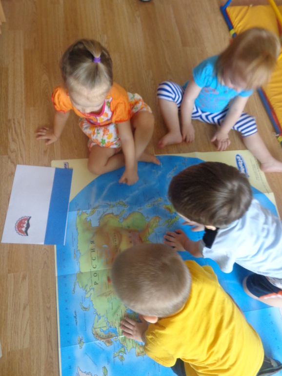 В начале мы рассмотрели карту, вспомнили материки которые уже знаем: Австралия, Африка, Антарктида. Нашли Россию и я предложила отправиться в одно замечательно место - п-ов Камчатка.