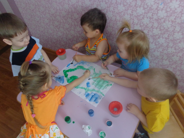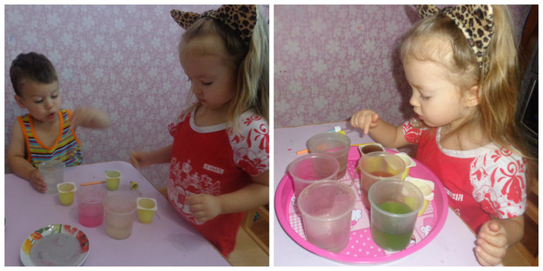 Смешивали разные краски путем переливания воды из одного стакана в другой. Эта игра затянулась на добрый час.