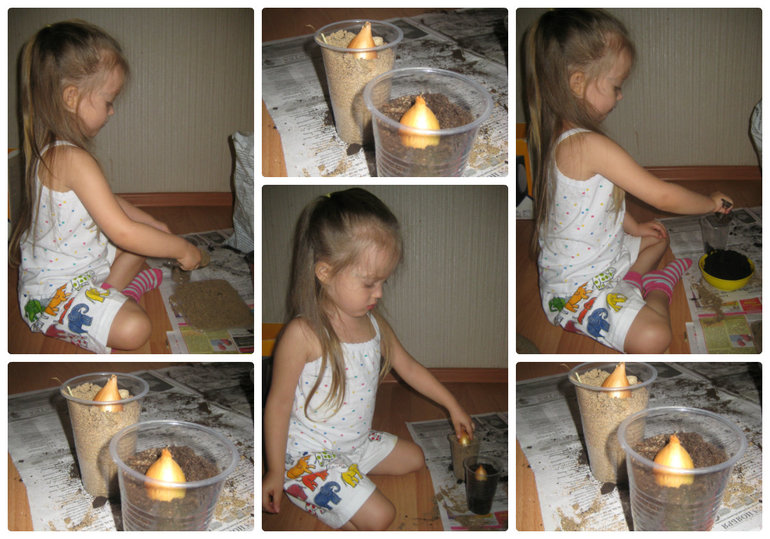 1. Где растению лучше. Набрали песок на прогулке, дома у бабушки нашли землю и посадили лук. Пока не взошел, уже неделя прошла :(