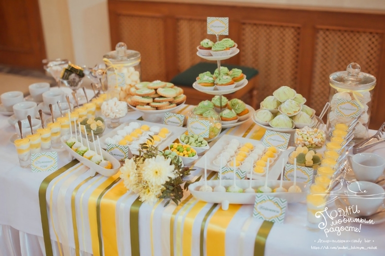 Candy bar1 июня мы оформляли сладкий стол для свадьбы замечательной яркой пары Алевтины и Евгения. Основные цвета праздника - лимонно-желтый и зеленый. Основной элемент свадьбы - ленты.