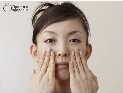 Часть 1. Поместить указательный, средний и безымянный пальцы рядом с ноздрями и плотно прижать. Скользить пальцами, надавливая, от ноздрей вдоль скул к вискам. Повторить 20 раз.