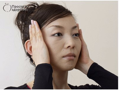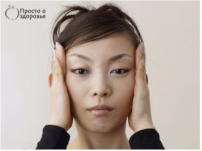 Поместите ладони так, чтобы пальцы находились на волосистой части области висков, а сами ладони непосредственно прижимали область височно-нижнечелюстного сустава, как на фото. Большие пальцы находятся за ухом (если положение выбрано правильно, они попадают в челюстную ямку за ухом). Пальцы спереди и сзади плотно прилегают. Начинайте делать пальцами скользящие, тянущие движения вверх, как бы приподнимая область скальпа. Если вы почувствовали как под пальцами поднимаются виски, область за ушами, скулы, значит, упражнение выполняется правильно. Сделайте 10 раз.