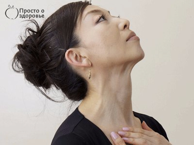 Предварительное упражнение перед началом массажа. Прижмите обеими руками область ключиц по центру и поднимите подбородок к потолку. Задержитесь в этом положении на 5 сек.