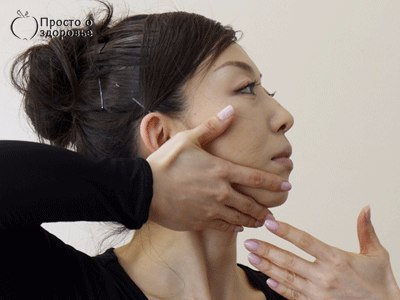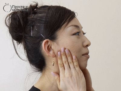Приложите пальцы на место соединения височно-нижнечелюстного сустава и скуловой кости, как на фото. Выполняйте надавливающие массирующие круговые движения в сторону уха. Повторите 20 раз.