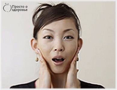 Поместить ладони обеих рук к внешним областям скул. Плотно прижать. Начинать приподнимать ладонями мышцы скул точно вверх, как будто мы хотим довести их до макушки. Повторить 10 раз.