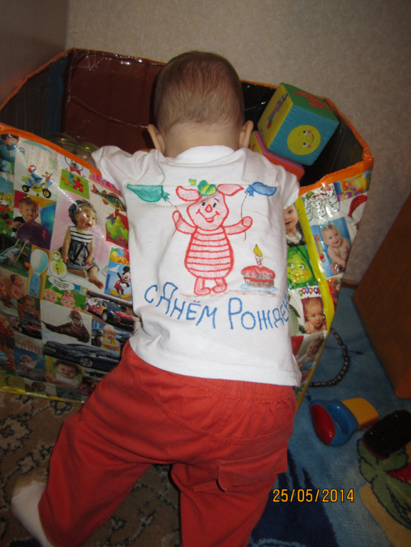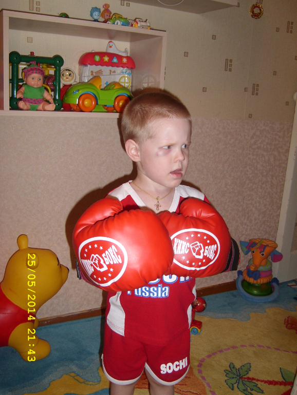 ПраздникиПригласили нас на день рождения в мае. Мы вечером долго выбирали наряд. И когда примерили, от радости Гера так прыгал, что свалился и ударился об угол кровати. Никакие холодные компрессы не спасли и наш спортивный наряд дополнил красивый, огромный синяк. В гостях нашлись красивые перчатки. Геру попросили сделать сердитое лицо) Он с задачей справился)