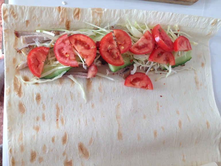 Недавно ездили в деревню. Мой папуля любитель запекать мясо))) Его запечённый свиной карбонат просто шедевр, пряный аромат, мягкий, тающие во рту......))) если честно не знаю как он это делает, рецепта у него нет, все на глазок! И один такой деликатес мы привезли домой. Я нашла ему применение для домашней шаурмы.