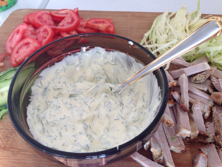 Соус: сметана , майонез, зелень, честнок. Все по вкусу