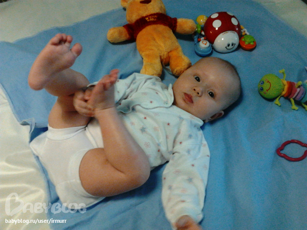 Сходили к врачу,рост 67 (выросли на 3см), вес 6665кг (поправились на 455гр всего), анализы все хорошо) гемоглобин правда 109, педиатр говорит маловато.. ну вес мало, наедайте говорит. Зубиков пока нет, хотя я думаю -на подходе, очень уж яростно грызем игрушки и при этом частенько злимся. Принимаем аквадетрим по 2 капельки с утра. Лейкоциты стали 4-6, и сделали полиемилит сегодня первый.Делаем массаж, у нас тонус в ножках, особенно с правой стороны.Поэтому ручки слабые, на локоточки не встает, вся сила внизу.Кричит, сопротивляется, так горько плачет.. смотри что мама рядом стоит и НИЧЕГО не делает,.. чувствую себя предателем(