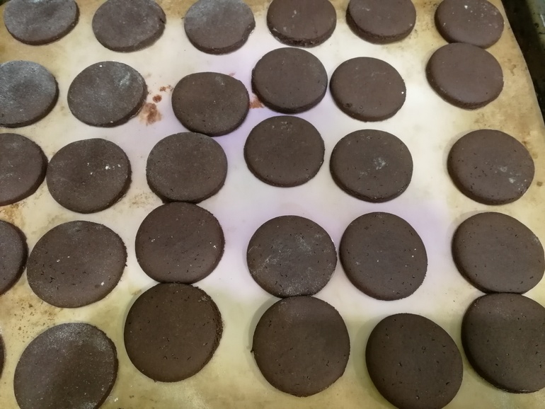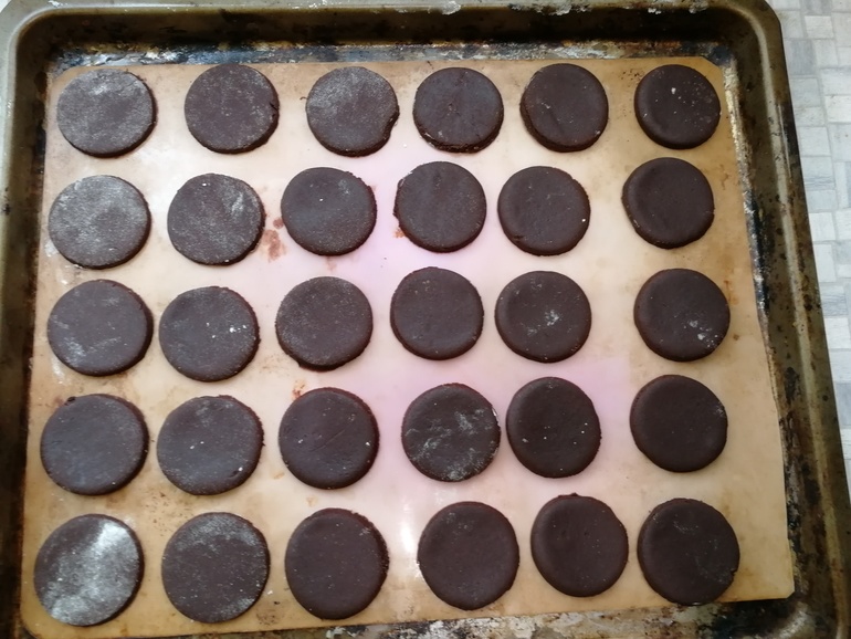 Раскатать в пласт 5-7 мм. Нарезать кружки рюмкой. Разложить на противне:
