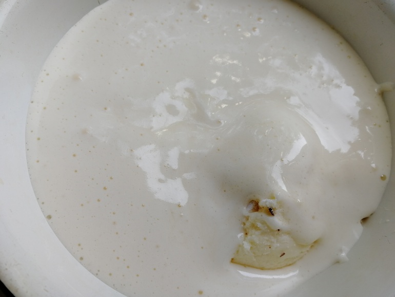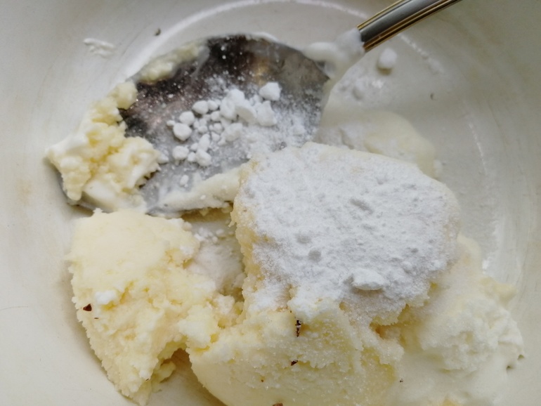 Для шоколадного теста размягченное сливочное масло (180 г) смешать с 1 ч.л. разрыхлителя: