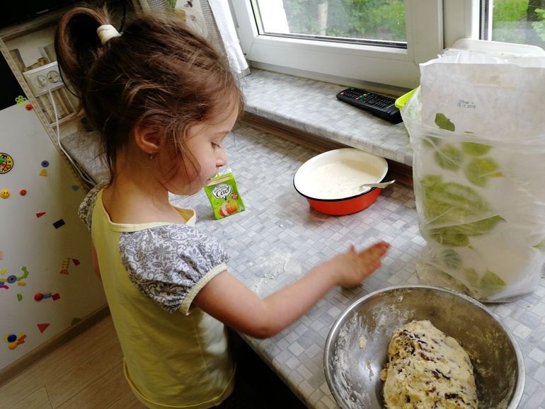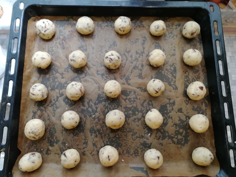 Скатать из теста шарики размером с грецкий орех. Внучка помогает: