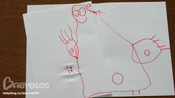 нарисовала сама. без чьей либо помощи. ну в принципе ясно, что есть глаза и рот, по бокам руки и на них, как она сказала когти.)) снизу кружок с точкой - это пупок) Наш папа у неё спрашивает: "Что это такое?" , а Варя говорит: "Это стлах (страх) такой" =) ну вообщем это её название своему рисунку)) хотя мне кажется, этот страх милый получился)