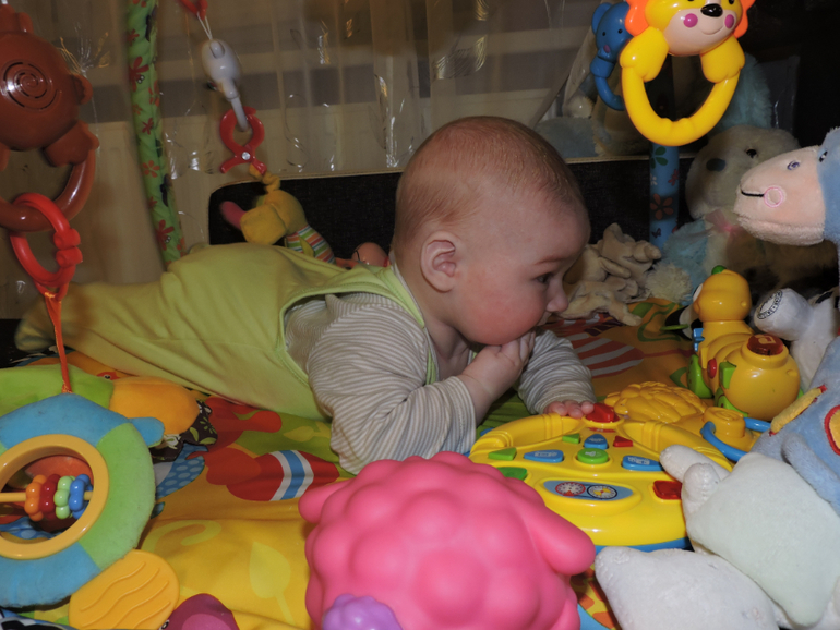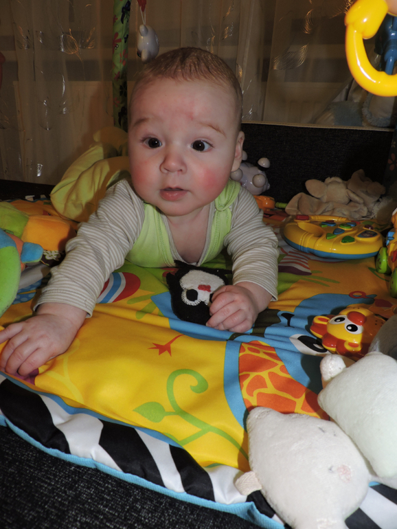 На горизонте два нижних зубчика такая тоненькая белая полосочка и слюней их миллион , во рту обе руки всегда или что то тащит какую нить игруху погремуху) В среду идём на осмотр , быстро летят месяца конечно в четверг нам будит 5 месяцев)